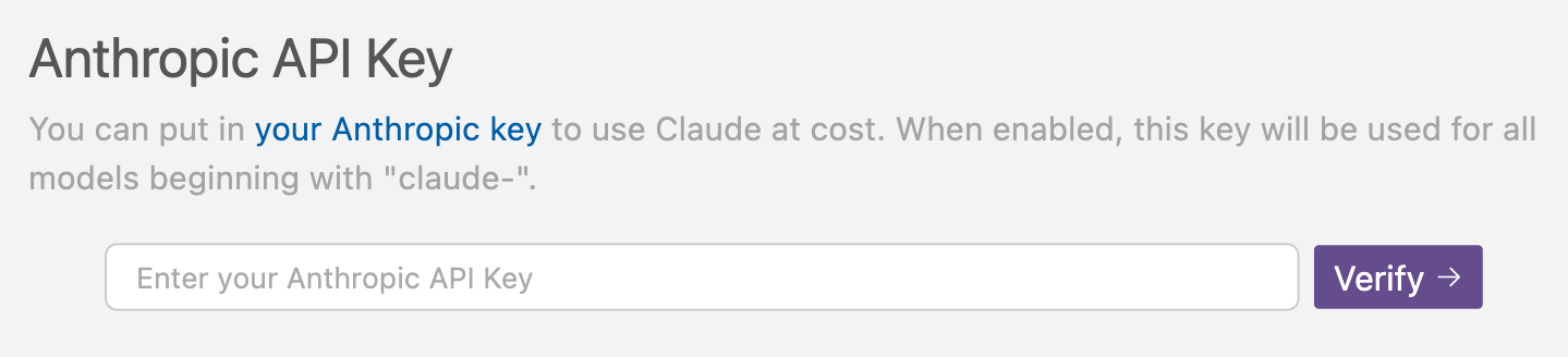 - Add it in Cursor Settings > Models > Anthropic API Key