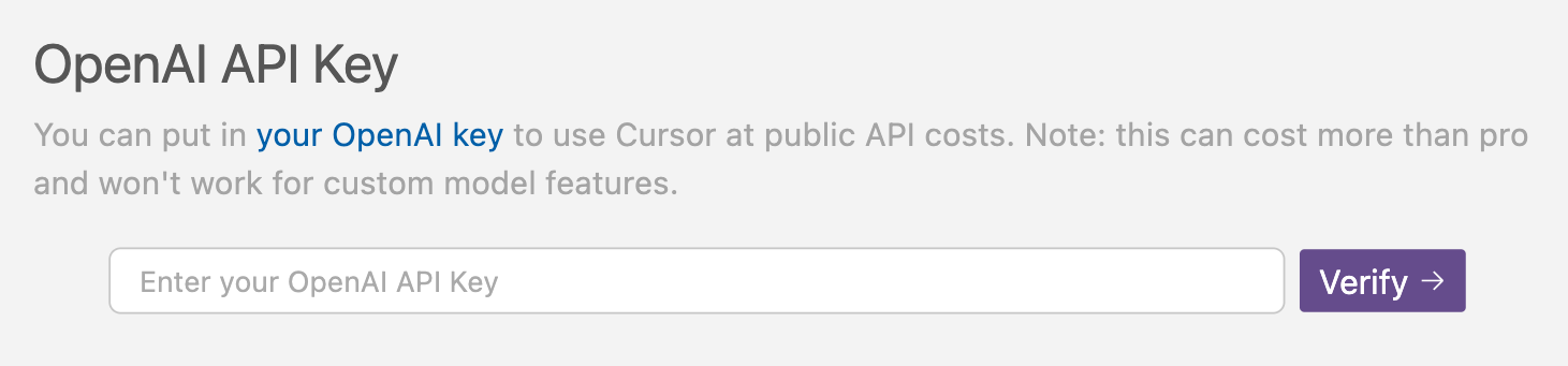 - Add it in Cursor Settings > Models > OpenAI API Key