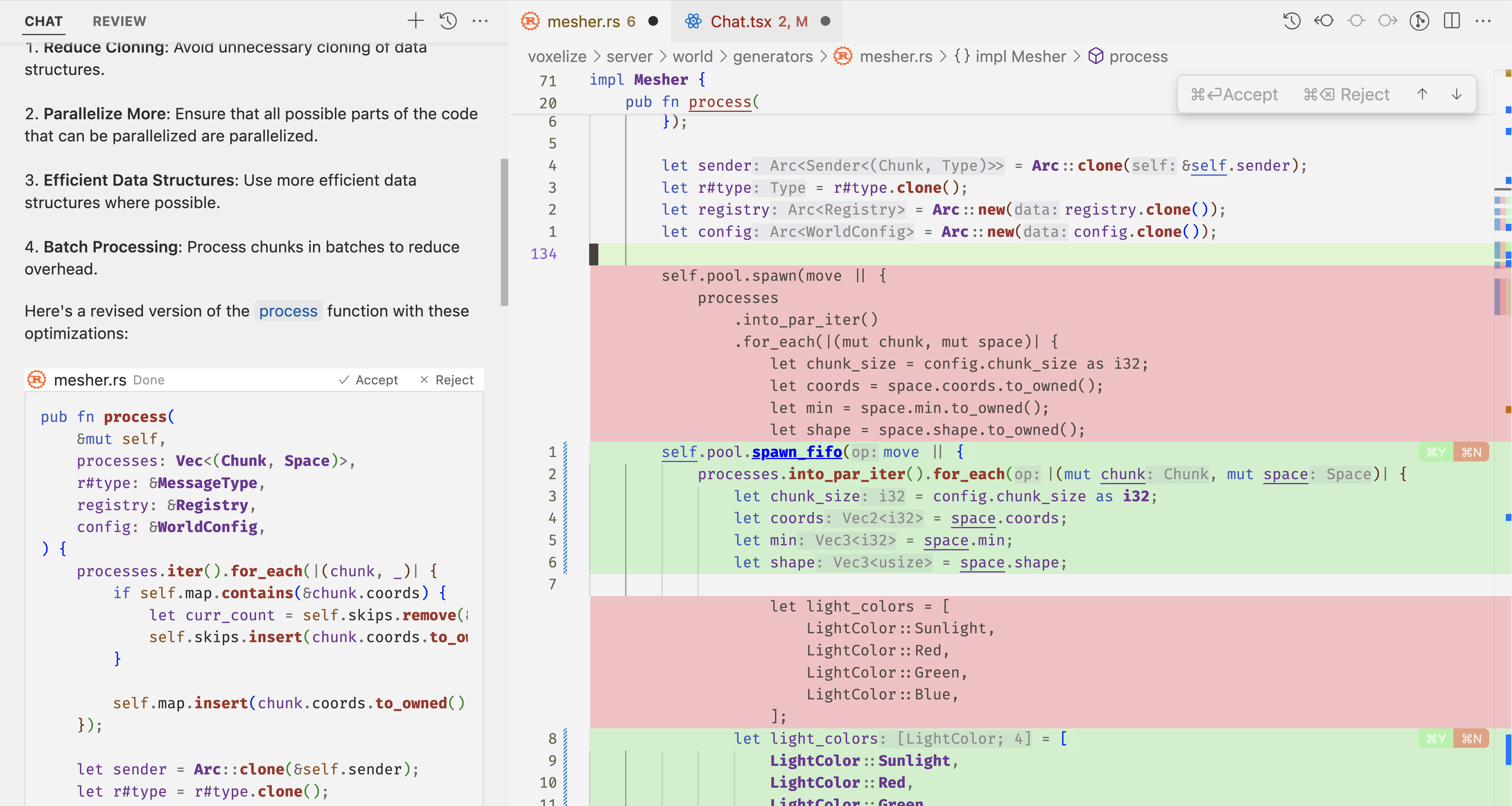 Once you have applied a code block, you can go through the diffs and accept or reject the changes. You can also click on the "Accept" or "Reject" buttons in the top right corner of the chat code block.