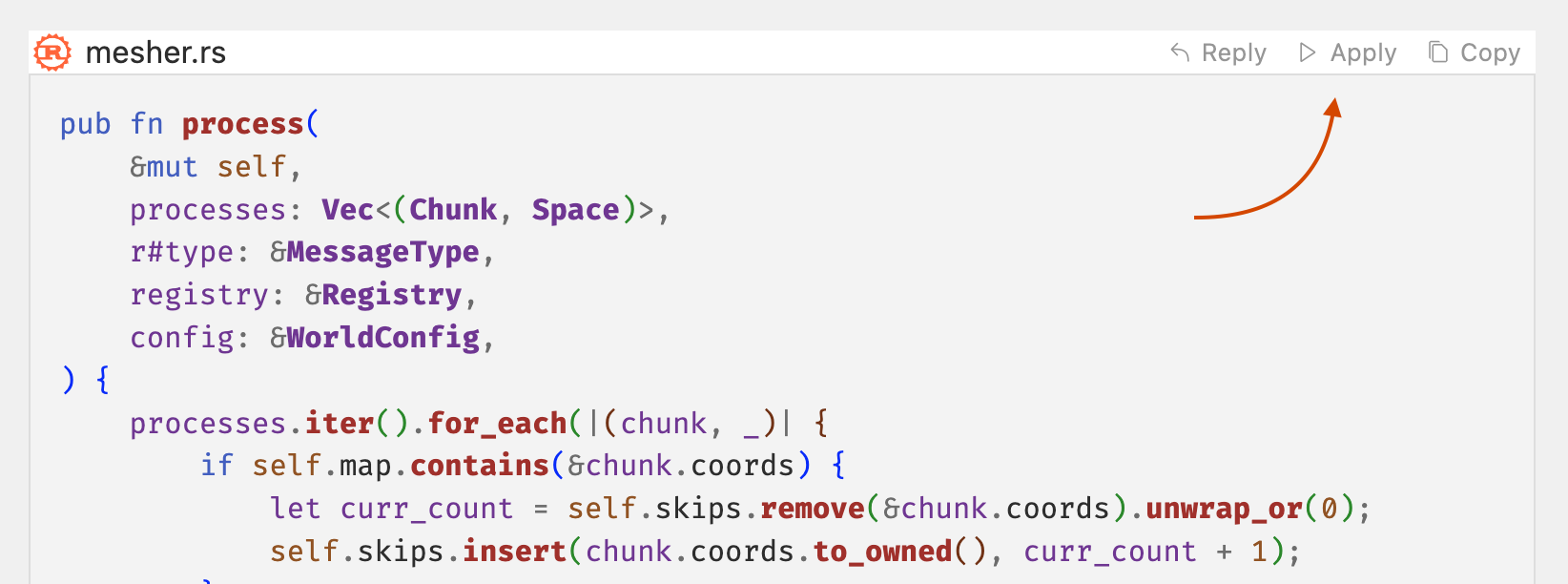 Cursor's Apply allows you to quickly integrate a codeblock suggestion from the chat into your code.