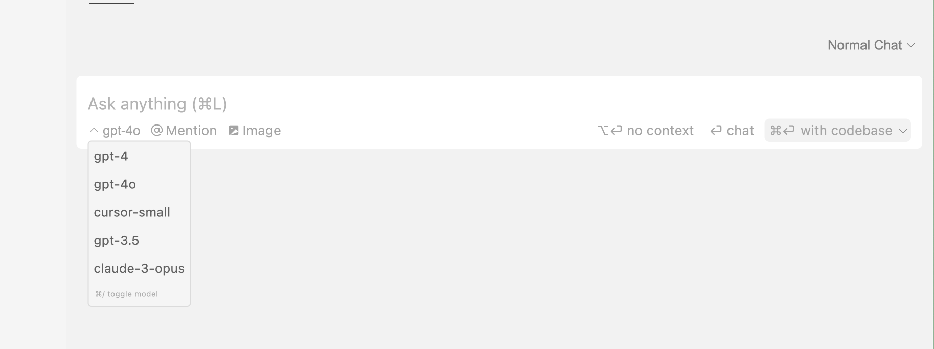 Pick your preferred AI model through the model toggle, and Cursor Chat will use that model to generate responses. You can toggle between models by pressing Ctrl/⌘ /.