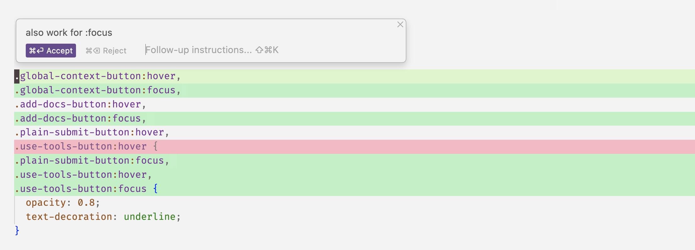 The contents of this conversation could be further used in follow-up generations, so you could simply type "do it" after Cursor comes up with a response to generate the code after a quick question.