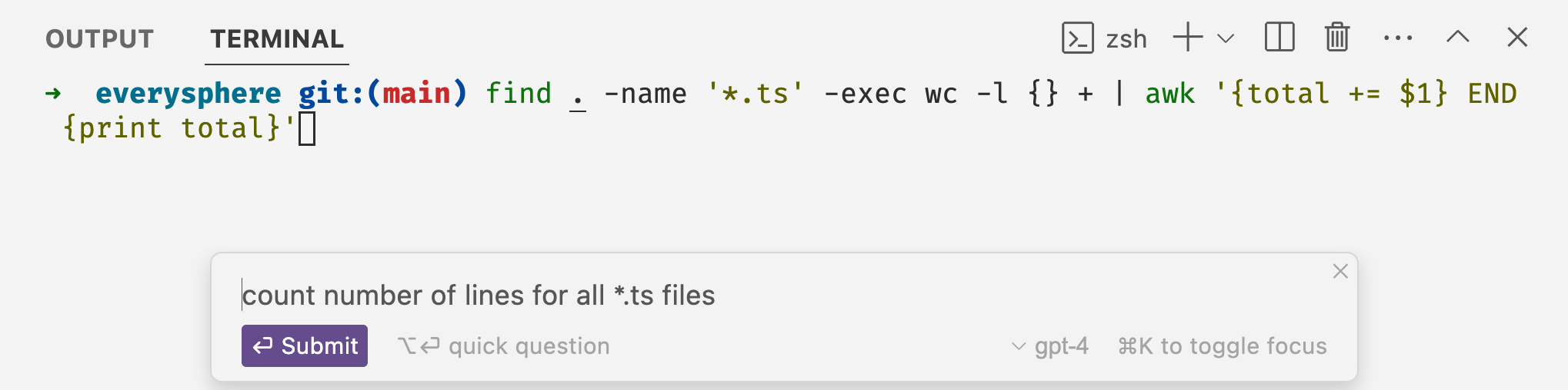 By default, Terminal Cmd K sees your recent terminal history, your instructions, and anything else you put in the prompt bar as context.