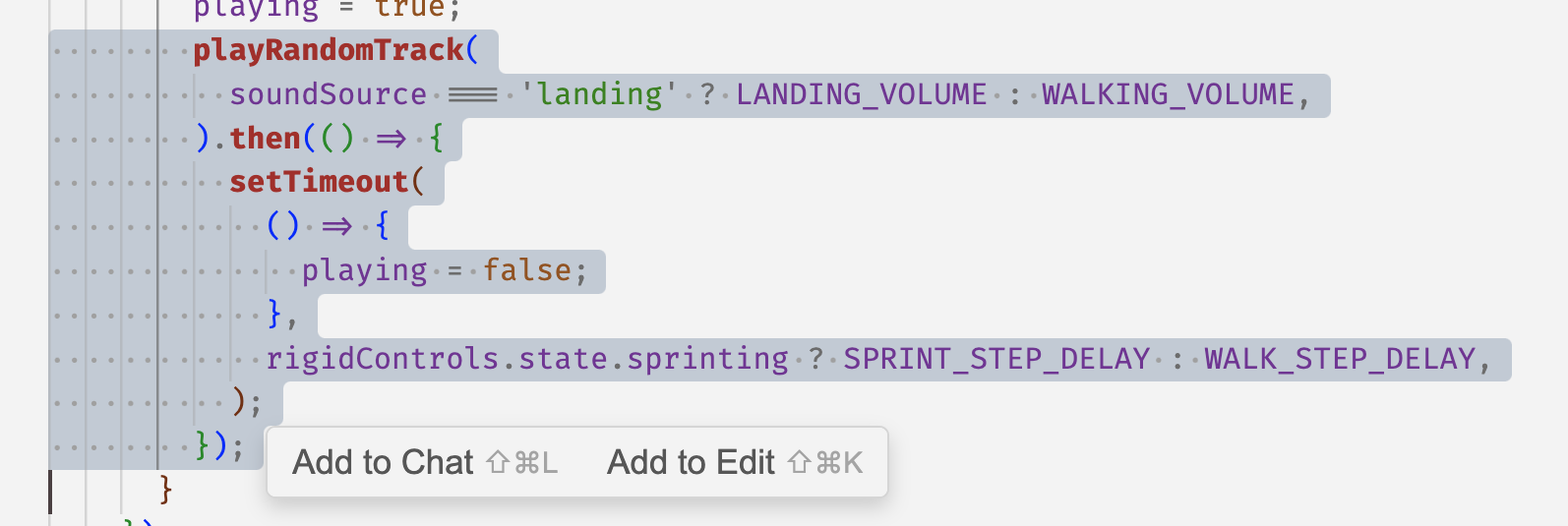 Another way to add code snippets as context is to select the code you want to reference, and click on either "Add to Chat" (Ctrl/⌘ Shift L) or "Add to Edit" (Ctrl/⌘ Shift K).